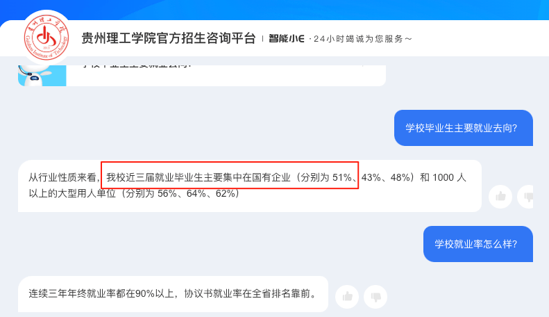 贵州理工学院是贵州省为实现“工业强省”打算而成立起来的一所高校,定位就是要培育急需的高本质理工类使用型人才。飞翔器制制工程和机械设想制制及其从动化都是国度级一流本科专业扶植点,结业生有51%都能正在国有企业就业!