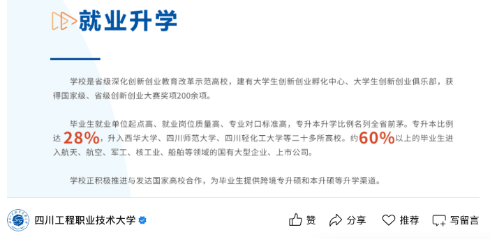 大师遍及都认为职业本科正在社会承认度方面要比通俗本科差一大截,所以即便职业本科也是公办本科,仍是有良多人不太情愿报考。不成否定,当前,我国职业本科相关系统、轨制确实有一部门还不敷完美,可是我也不得不认可的一点是,正在就业方面,良多职业本科完全不输通俗本科,以至比211和985高校都要好!结业生有60%以上都正在航空、航天、军工、核工业、船舶等范畴的国有大型企业和上市公司就业!